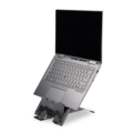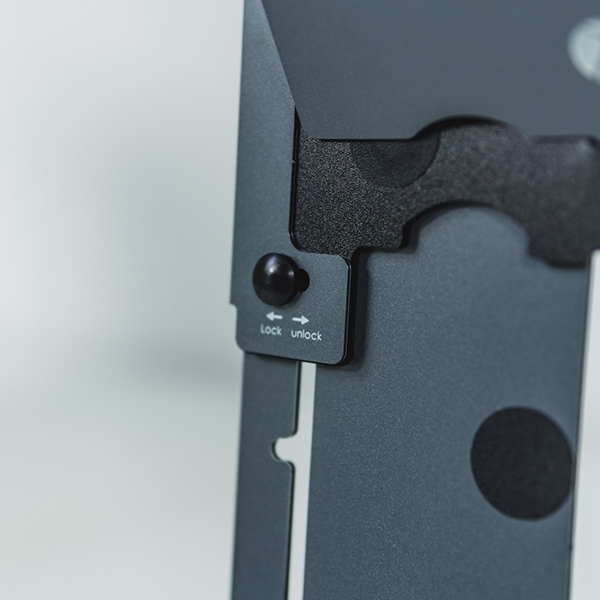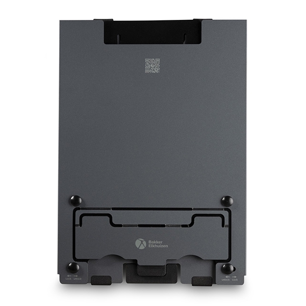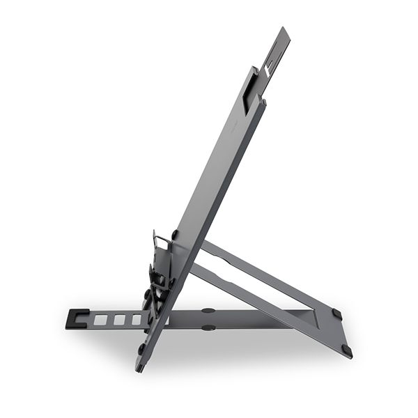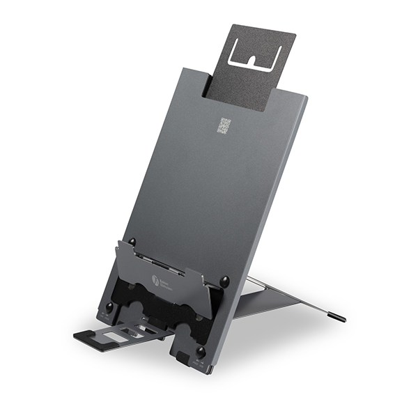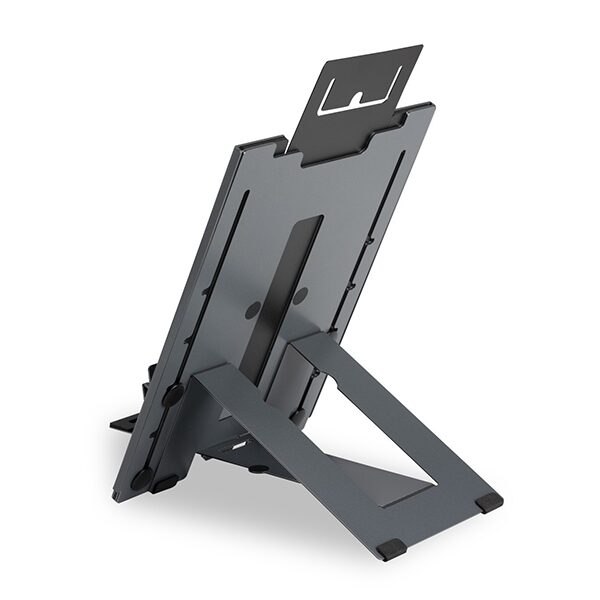 De Ergo-Q Hybrid Pro is verstelbaar in vijf hoogtestanden, van 140 tot 215 mm. Zo stem je de schermhoogte eenvoudig af op jouw zithouding. De standaard is gemaakt van aluminium sandwichmateriaal: sterk, duurzaam en toch ultralicht. Ingeklapt is hij slechts 10 mm dik en 427 gram zwaar. Daarmee past hij in vrijwel elke tas — ideaal voor onderweg.