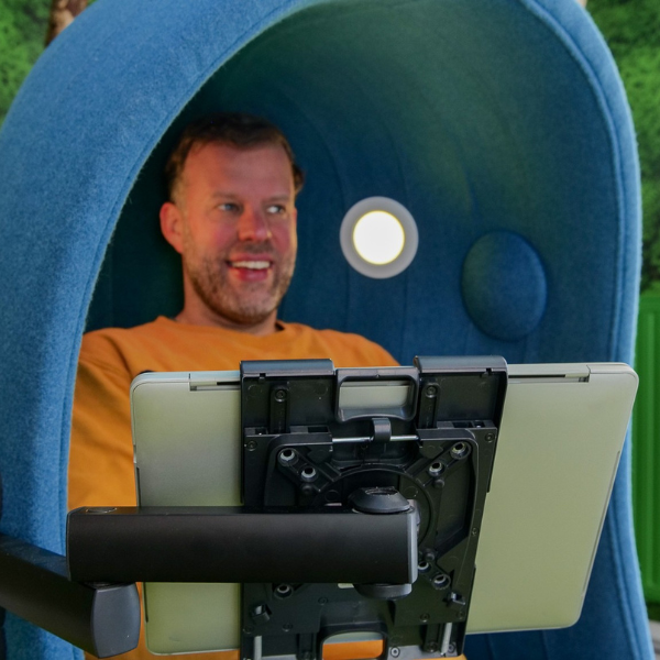 De Ergoline 4-Senses akoestische stoel reduceert omgevingsprikkels, hierdoor komt de persoon in zijn eigen veilige omgeving tot rust. Let op: de tablethouder heeft een nieuw model (zwart).