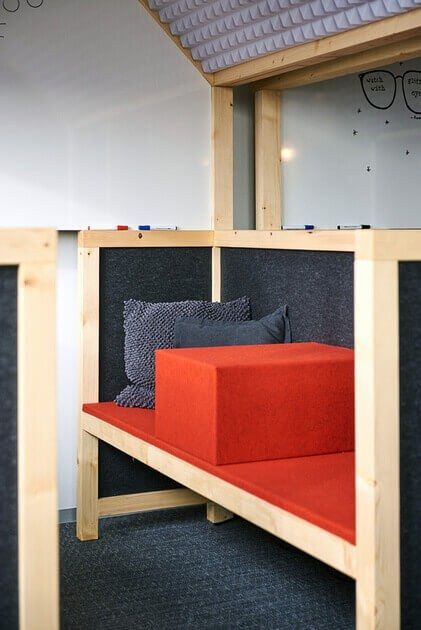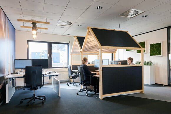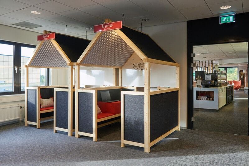 De akoestische werkhuisjes en plafonds zijn uniek in Nederland en gebouwd van volledig duurzame materialen. De huisjes komen tegemoet aan de behoefte van werknemers om in een open ruimte rustig te kunnen werken. De moswanden zorgen voor demping en een gezonder werkklimaat. De tafeltennistafel fungeert als vergadertafel en natuurlijk kun je er terecht voor een potje tafeltennis! Een groot succes onder de werknemers.